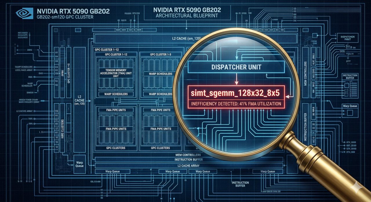 magma_sgemmEx_kernelcode path at 32% FMA pipe util. (MAGMA was NVIDIA's pre-CUTLASS linear algebra library from the early 2010s, largely absorbed into cuBLAS — the fact that its kernels still appear in the dispatch path on a 2026 GPU is a window into how deep the legacy debt goes in NVIDIA's stack.) -