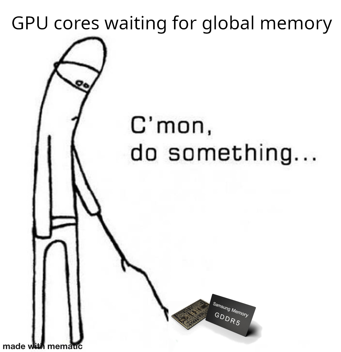 To work around this limitation, GPUs employ several techniques, such as using shared memory -a small amount of memory shared among a group of threads. This allows threads to cooperate and share data without accessing global memory, which is significantly slower. Another technique is to use memory coalescing, which enables threads to access memory in a way that minimizes the number of memory transactions. This is achieved by ensuring that threads access contiguous memory locations, which allows the GPU to fetch multiple data elements in a single memory transaction. GPU cores also have access to more registers than CPU cores, which can also be used to store intermediate data. However, registers are shared among cores (threads in a workgroup), so if you're using too many, some cores will be turned off.