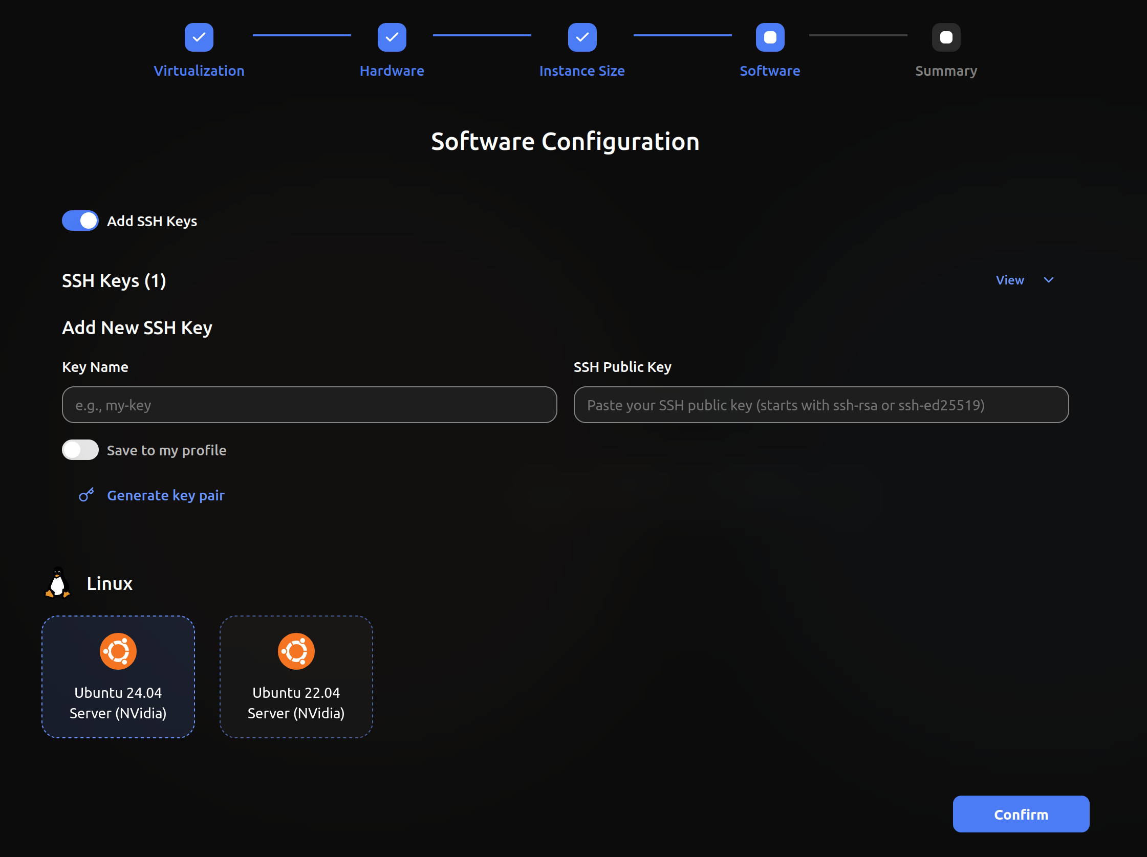 On the software configuration screen, choose how to access the machine. Using an SSH key for authentication is more convenient and secure. If you're not familiar with SSH, disable the "Add SSH Key" option, and a password will be generated that you can use to log in instead.