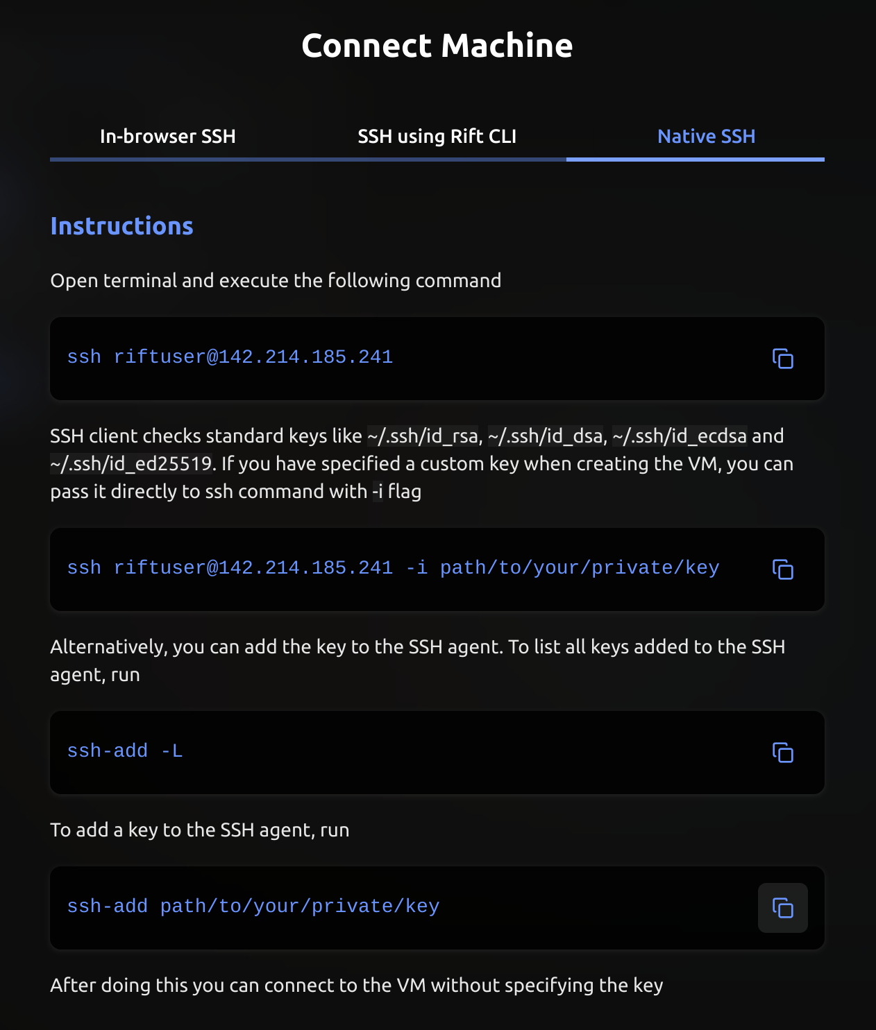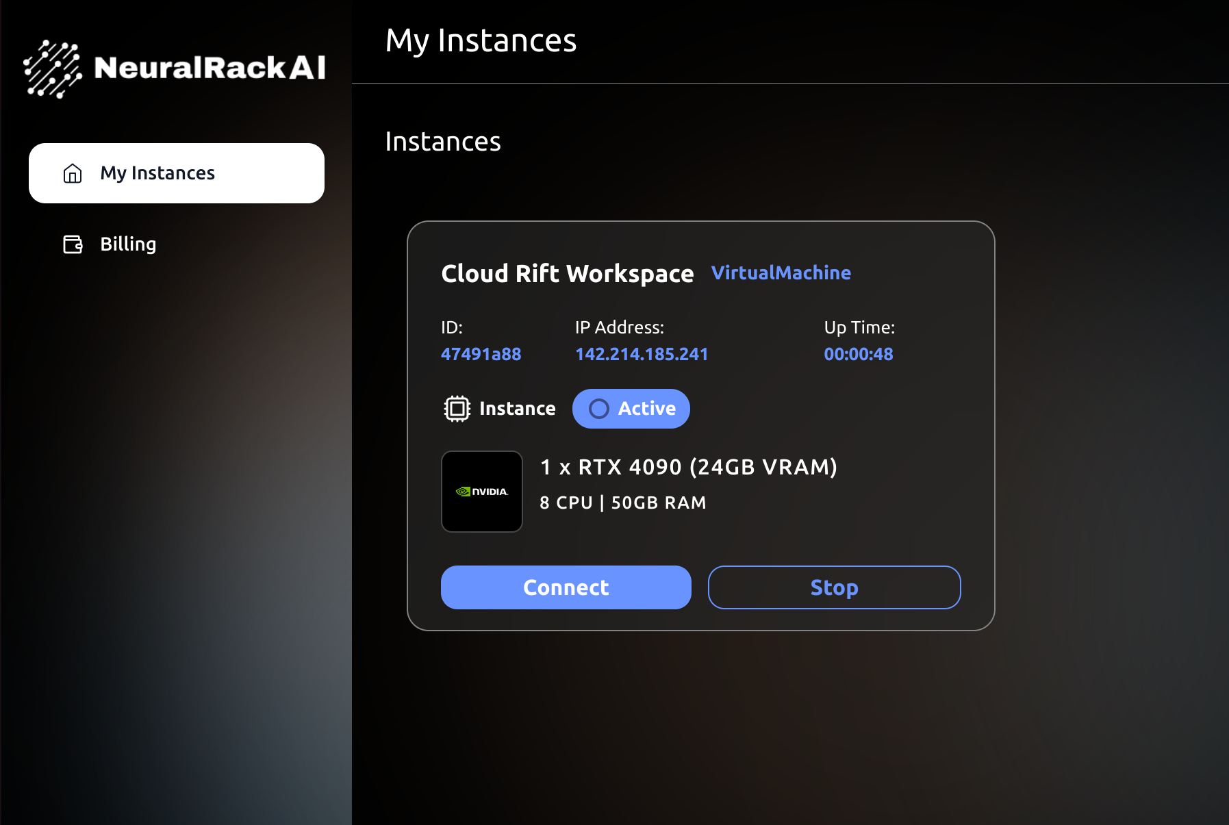 You will see an instance in the dashboard. GPU machines typically take about a minute to provision, while CPU-only machines are faster. Click the Connect button.