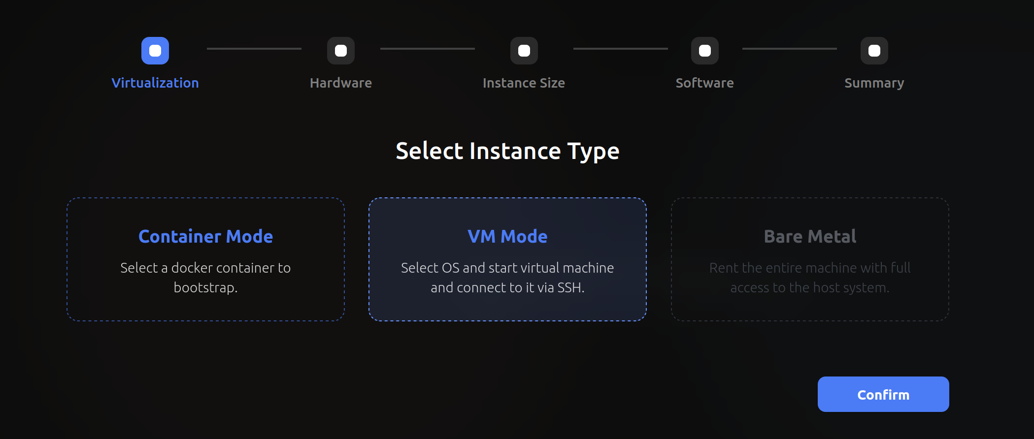 To rent a Virtual Machine, select "VM Mode" after clicking the "New" button on the "My Instances" page.