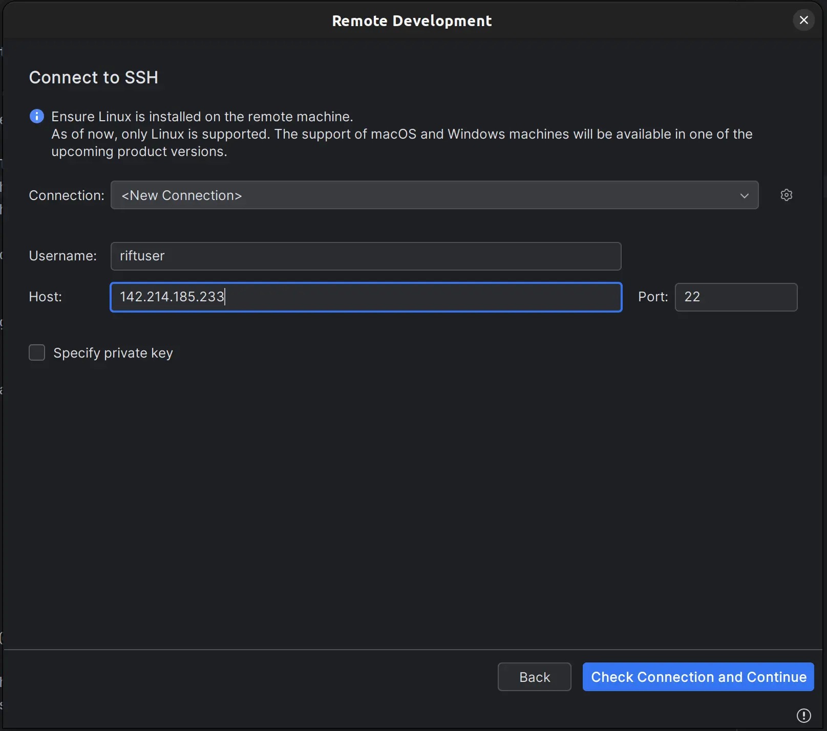 Click "New Connection" and specify riftuser as the username and a node IP address as the Host.