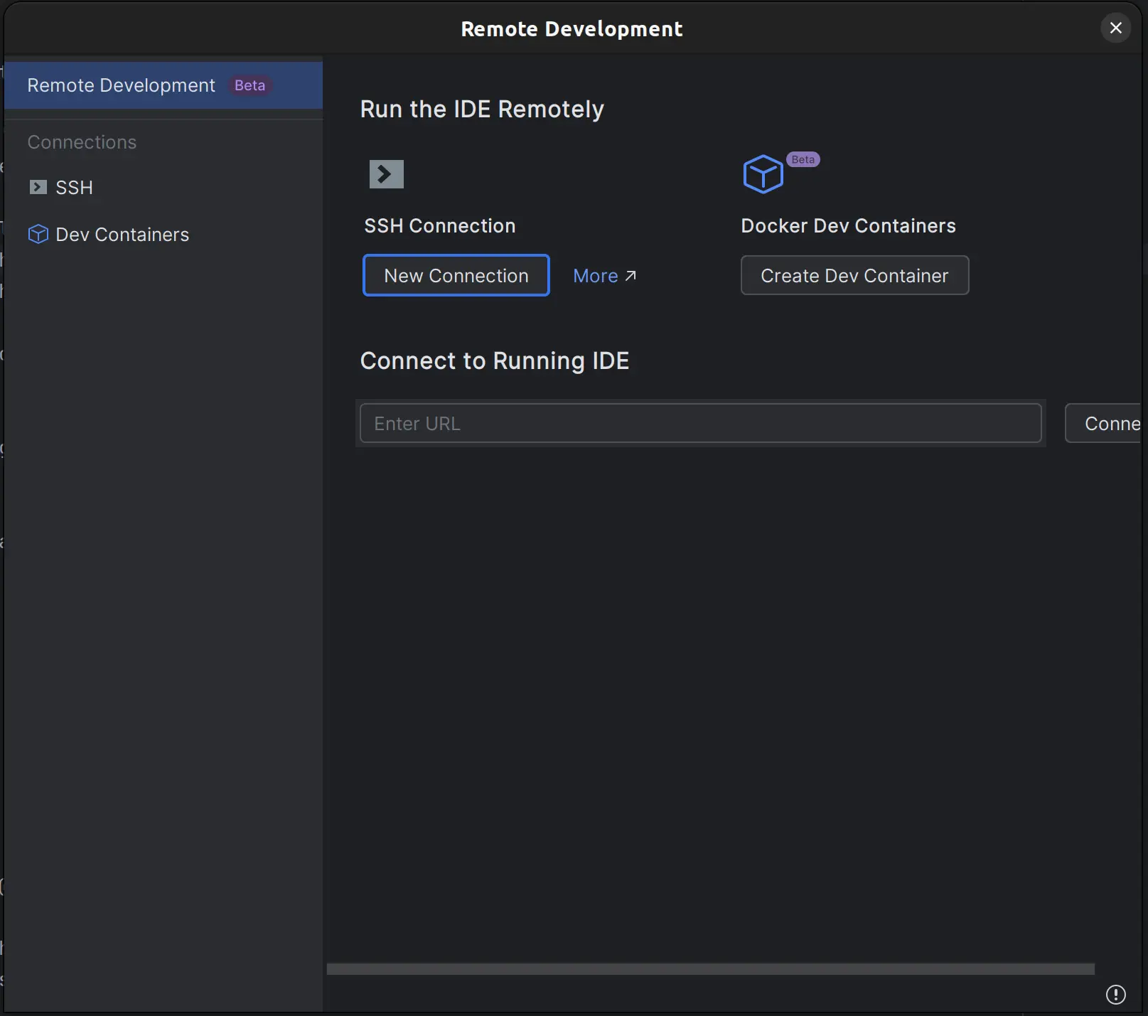 To start, open any JetBrains IDE (update to the latest version) and select File -> Remote Development. You can also do it without installing JetBrains IDE via JetBrains Gateway.