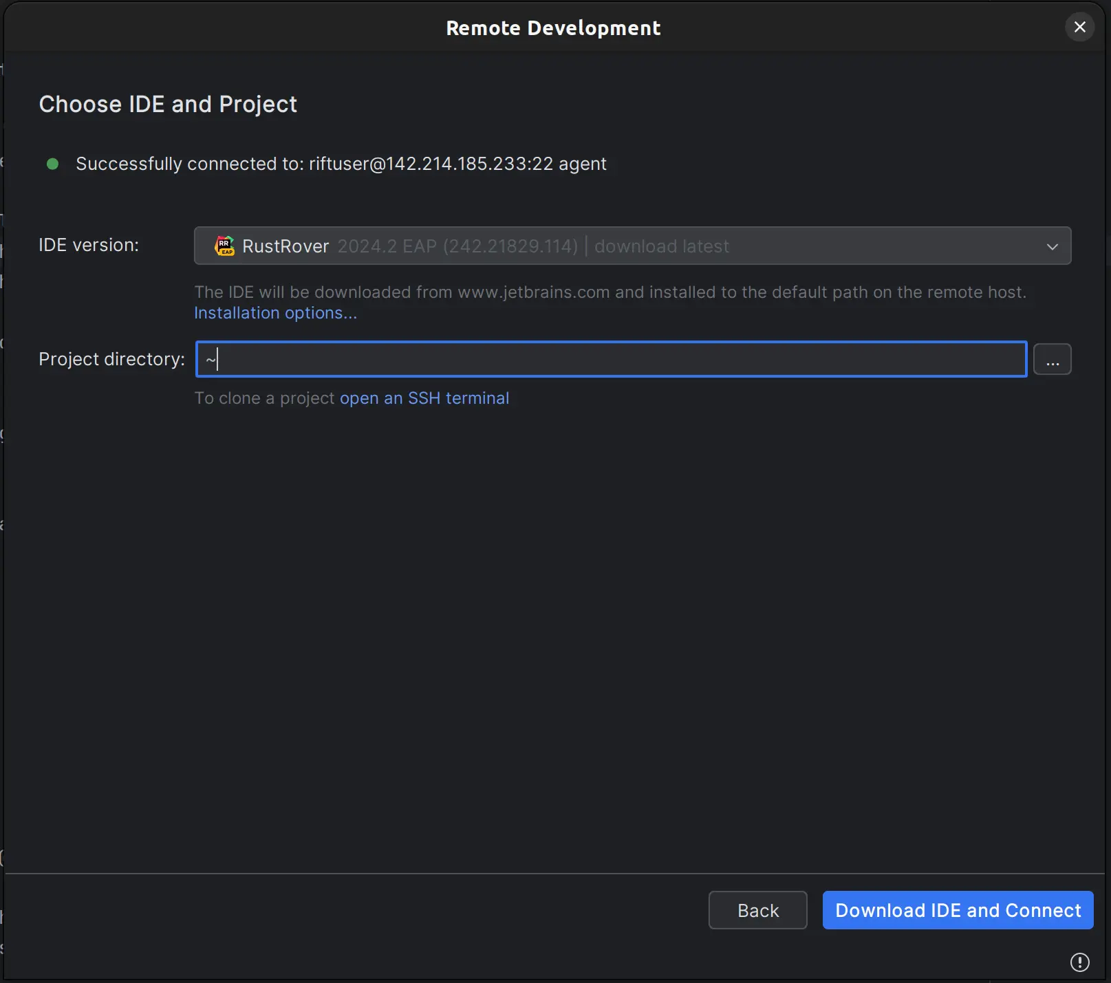On the next screen, choose the IDE you want to use and specify ~ as the Project directory.